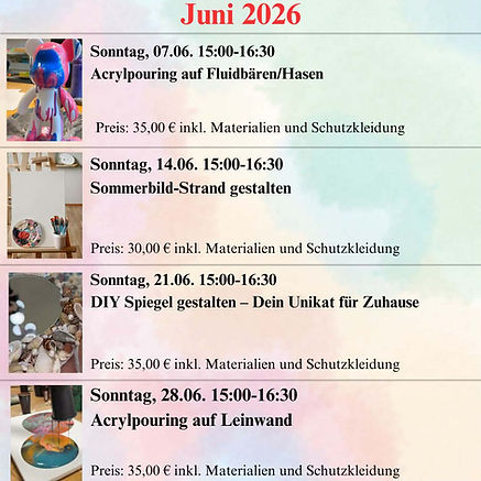 Themen wie Acrylpouring, Strukturkunst, Kerzen herstellen, kreativ mit Modelliermasse, die Kunst des Marmorierens, Textil Painting und vieles mehr wird bei uns stattfinden. Die Einzeltermine für die entsprechenden Themen dauern eineinhalb Stunden.